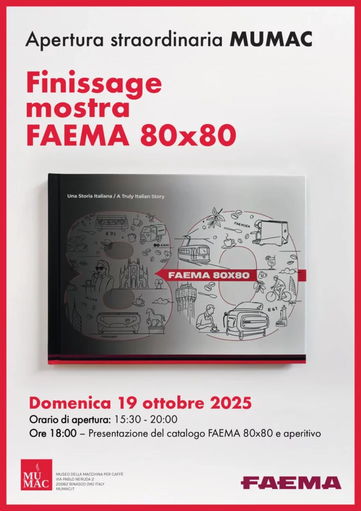 Domenica 19 ottobre, il Museo ospiterà il finissage della mostra “FAEMA 80×80”, un percorso che racconta 80 anni di innovazione e passione. Alle 18:00 è prevista la presentazione del catalogo della mostra con Maria Vittoria Rinaldi, Barbara Foglia e Roberto Mutti, seguita da un aperitivo celebrativo.